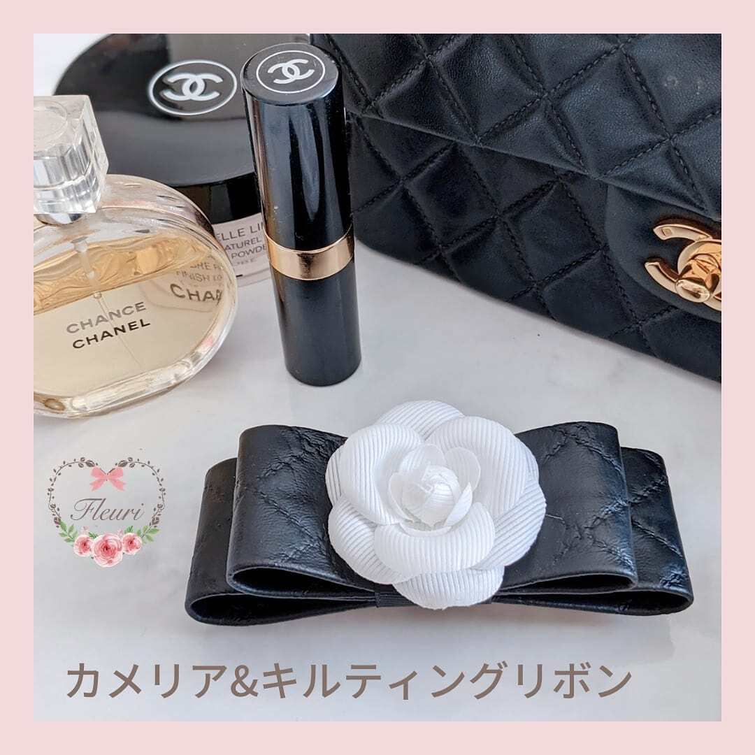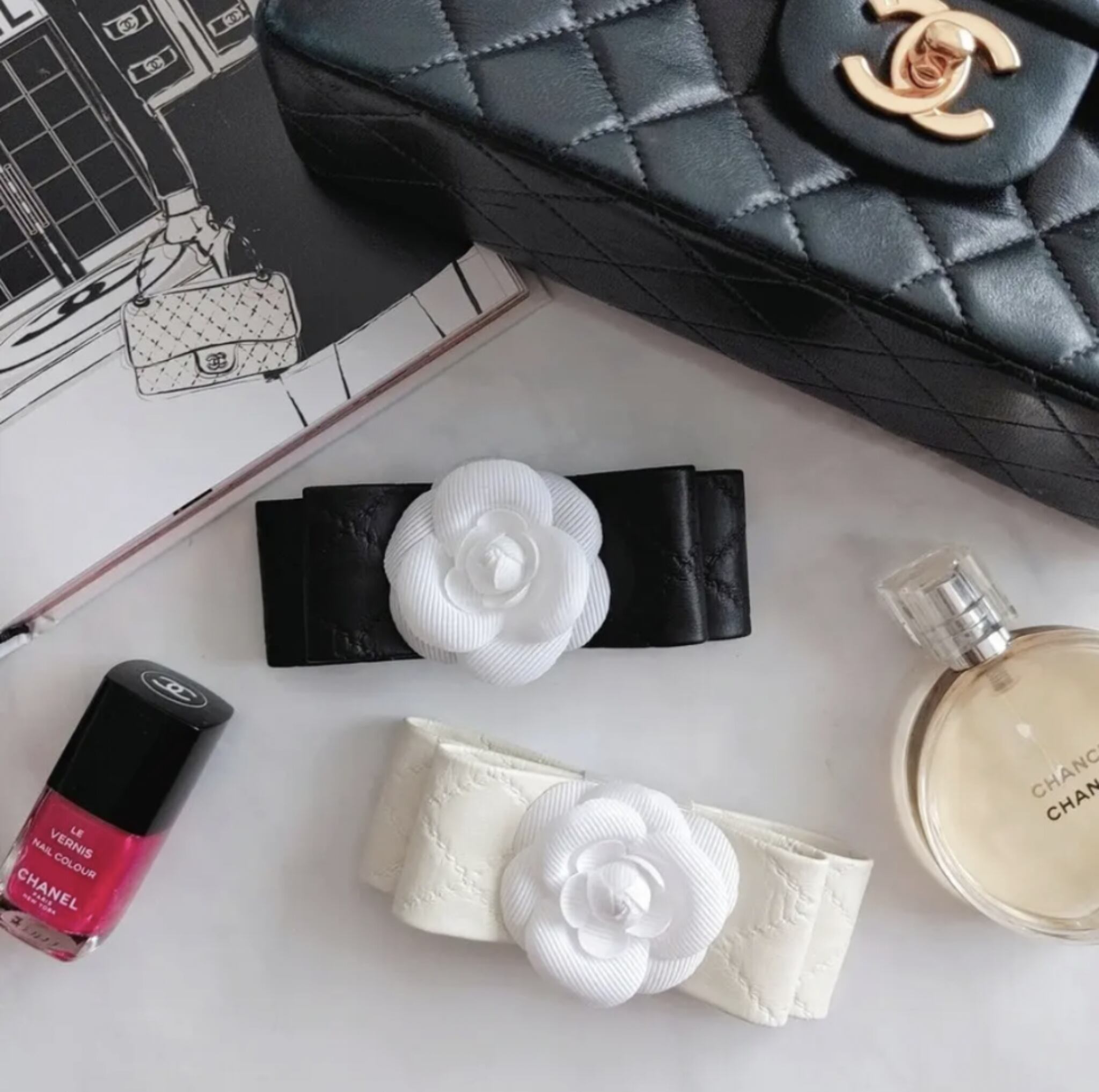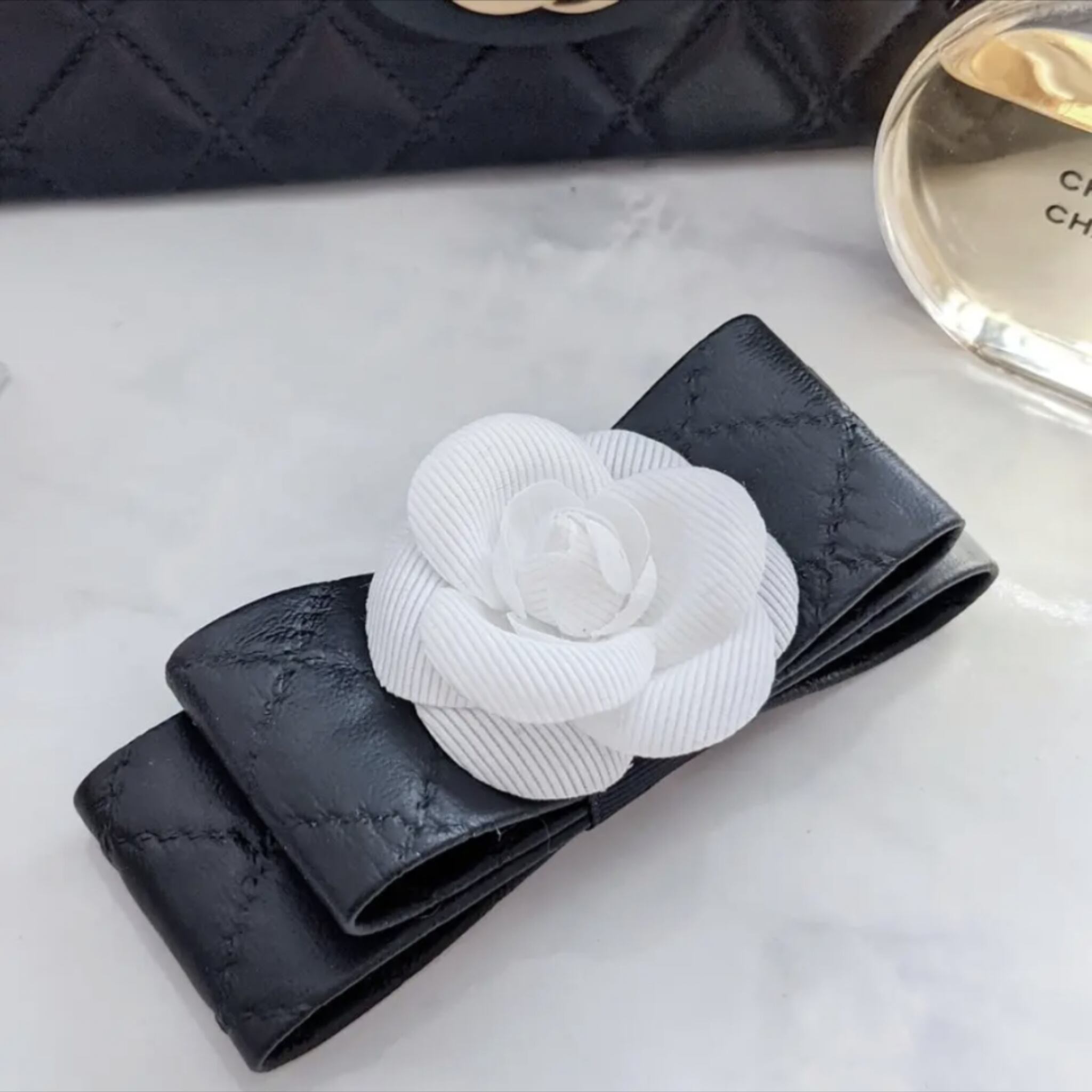 真っ白のカメリアとレザー調キルティングリボン(黒と白)のバレッタです